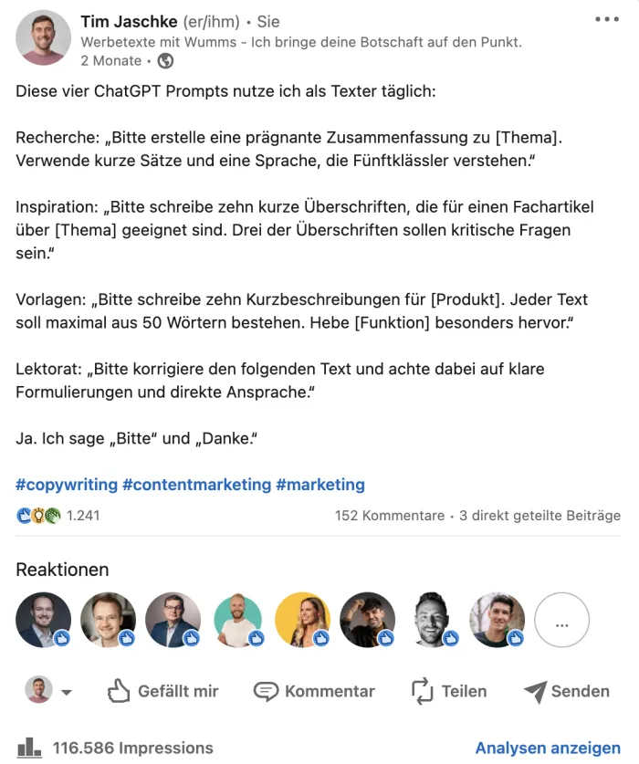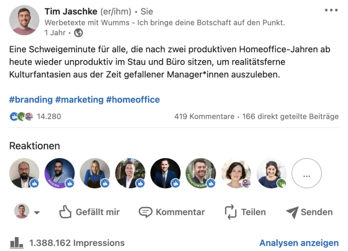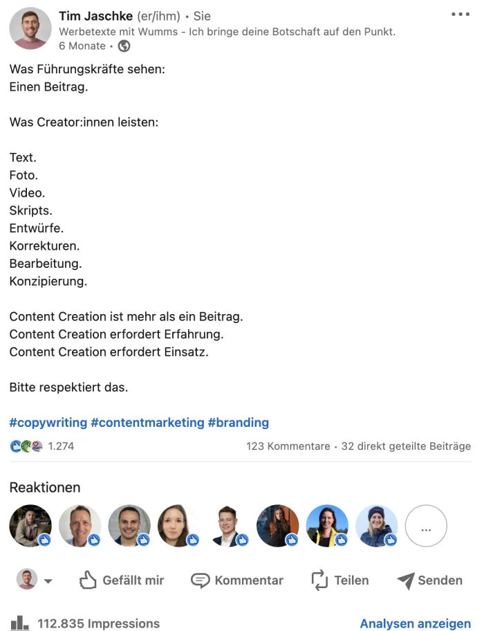 Bei meinen Recherchen fielen mir besonders deine Inhalte auf LinkedIn auf: gute Themen mit beeindruckender Qualität. Der Austausch mit dir war von Beginn an sympathisch und unkompliziert. Dank dir konnte unser Team ein tieferes Bewusstsein für wichtige Kommunikationsprinzipien entwickeln und eine wahre Begeisterung dafür entdecken. Unsere Zusammenarbeit mit dir war stets unkompliziert, hilfreich und einfach sympathisch. Es war besonders wertvoll, wie du Insights aus deinem eigenen Erfahrungsschatz geteilt hast. Ich würde dich ohne zu zögern an andere weiterempfehlen.