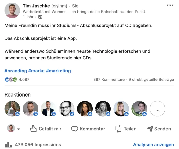 Seit 4,5 Jahren beschäftige ich mich beruflich mit Werbung. In dieser Zeit habe ich viele Unternehmen kennengelernt, denen der Wumms fehlt. Ihre Botschaften sind unklar, sie erreichen ihre Zielgruppe nicht und gewinnen deshalb keine neuen Kunden.