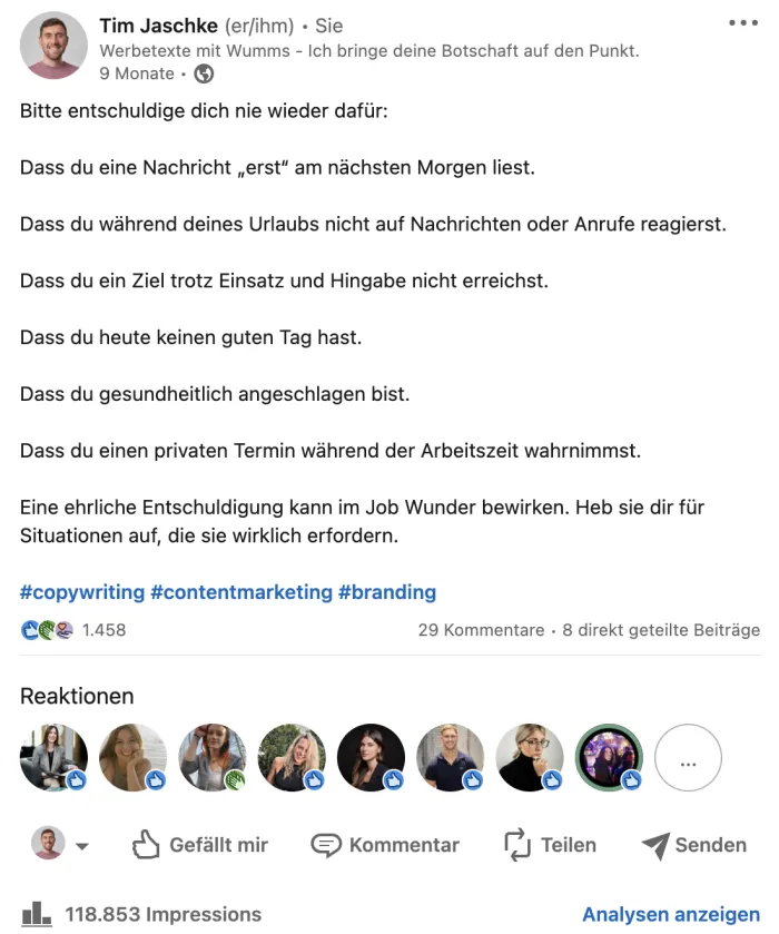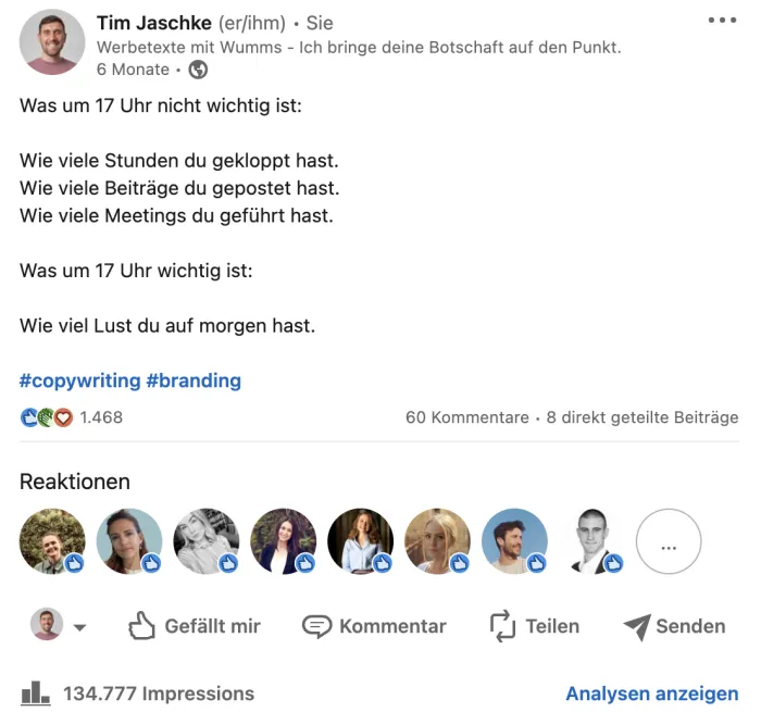 Meine Texte erreichen jede Woche mehr als 200.000 Menschen über Social Media, Werbekampagnen, Webseiten und E-Mails. Sie generieren jeden Tag Klicks, Kunden und Kaufabschlüsse.